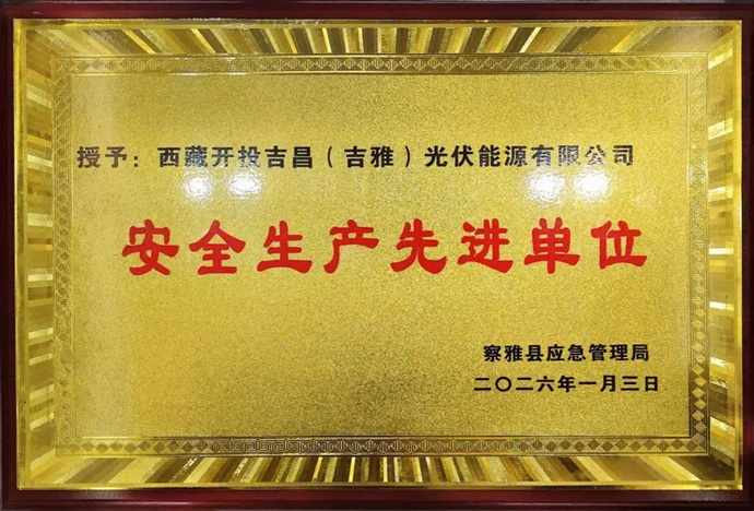 近日,西藏開投吉昌(吉雅)光伏能源公司被察雅縣應急管理局授予安全生產先進單位榮譽稱號?! 〈隧棙s譽的獲得,是地方政府對公司安全